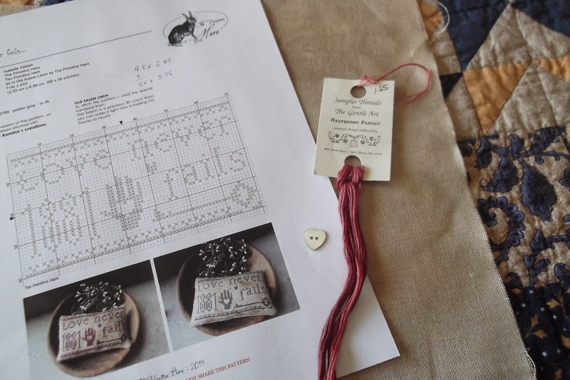 I got patterns, some of her wonderful hand dyed floss, buttons, charms, ric rac and lace.